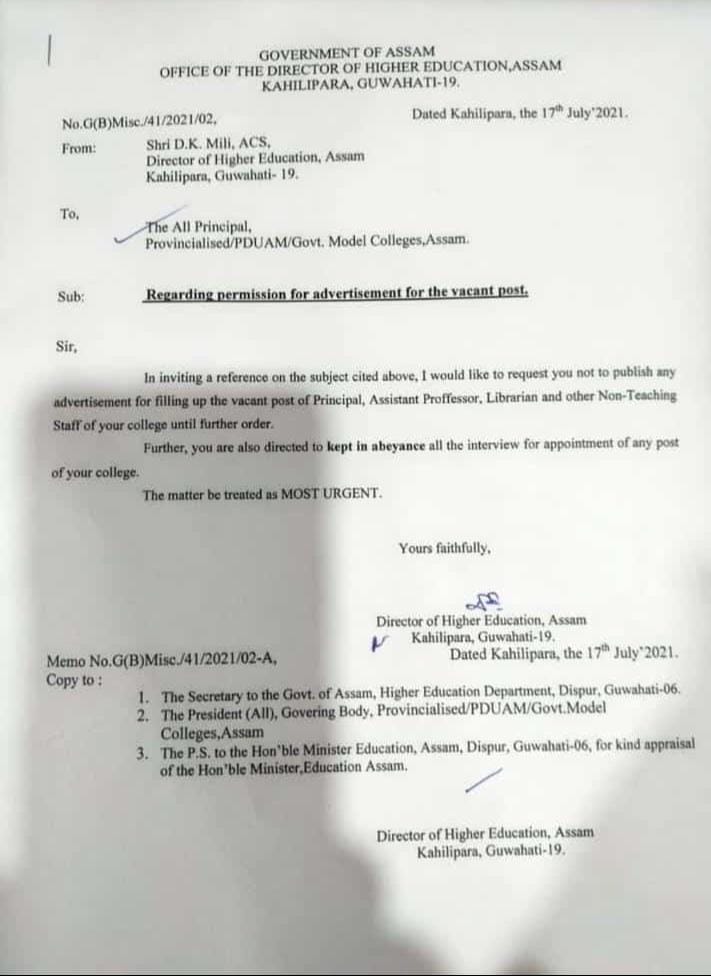 উচ্চ শিক্ষা সঞ্চালকালয়ে ৰাজ্যৰ সকলো প্ৰাদেশীকৃত, চৰকাৰী আৰু মডেল মহাবিদ্যালয়লৈ নিযুক্তি বন্ধৰ বাবে এখন জাননী প্ৰেৰণ কৰিছে যদিও জাননীখনত স্পষ্ট কৰি দিয়া নাই যে কিয় এনে নিৰ্দেশ দিয়া হৈছে। আনহাতে অসম মহাবিদ্যালয় অধক্ষ্য কাউঞ্চিল আৰু অসম কলেজ শিক্ষক সন্থাকো এই বিষয়ে জনোৱা হোৱা নাই কোনা কথা।