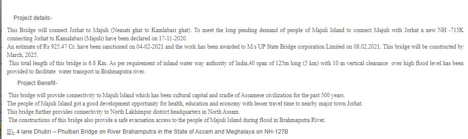 এই বিবৃতিত কোৱা হৈছে যে নতুন দলঙখন নিৰ্মান হ’ব যোৰহাটৰ নিমাতীঘাটৰ পৰা মাজুলীৰ কমলাবাৰী ঘাটলৈ ৷ মাত্ৰ ৬.৮ কিলোমিটাৰ দৈৰ্ঘ্যৰ দলঙখনৰ নিৰ্মান ব্যয় হ’ব ৯২৫ কৌটি টকা ৷ নিৰ্মানৰ দায়িত্ব লাভ কৰিছে উত্তৰ প্ৰদেশৰ চৰকাৰী সংস্থা ইউ পি ব্ৰীজ কৰ্পোৰেশ্যন লিমিটেডে ৷ অৰ্থাৎ আধাৰশিলাৰ পৰা নিৰ্মানকাৰ্য আৰম্ভ হোৱালৈকে মাজুলীৰ প্ৰস্তাৱিত দলঙৰ আধাতকৈও বেছি অংশ অন্তৰ্ধান হৈ পৰিল ৷টেকেলীফুটা , দিচাংমুখ , ঢকুৱাখানাৰ লগত নতুন দলঙখনৰ কোনো সম্পৰ্ক নাথাকিব ৷ দলঙ নিৰ্মান হ’ব কেৱল নিমাতীঘাটৰ পৰা কমলাবাৰীলৈ ৷ এইদৰেই বৃহৎ দলঙ প্ৰকল্পটোৰ আধা অংশ নিৰ্মানর্কা্ৰ্য আৰম্ভ কৰাৰ সময়তেই কৰ্তন কৰিলে প্ৰধানমন্ত্ৰী নৰেন্দ্ৰ মোদীয়ে ৷ তাতোকৈ আক্ষেপৰ কথাটো হ’ল ফেব্ৰুৱাৰী মাহত নিৰ্মানকাৰ্য আৰম্ভ হোৱাৰ পাছতো সাত মাহ উকলি গ’ল ৷ এই সাত মাহত এটা খুটাৰো নিৰ্মান কাৰ্য সম্পন্ন নহ’ল ৷অথচ প্ৰাক্তণ মুখ্যমন্ত্ৰী সৰ্বানন্দ সোণোৱালৰ অহা যোৱাত সুবিধা হোৱাকৈ এই সময়ছোৱাত মাজুলীত প্ৰায় ১ কৌটি টকা ব্যয় সাপেক্ষে নিৰ্মান কৰা হ’ল অত্যাধুনিক হেলিপেড ৷