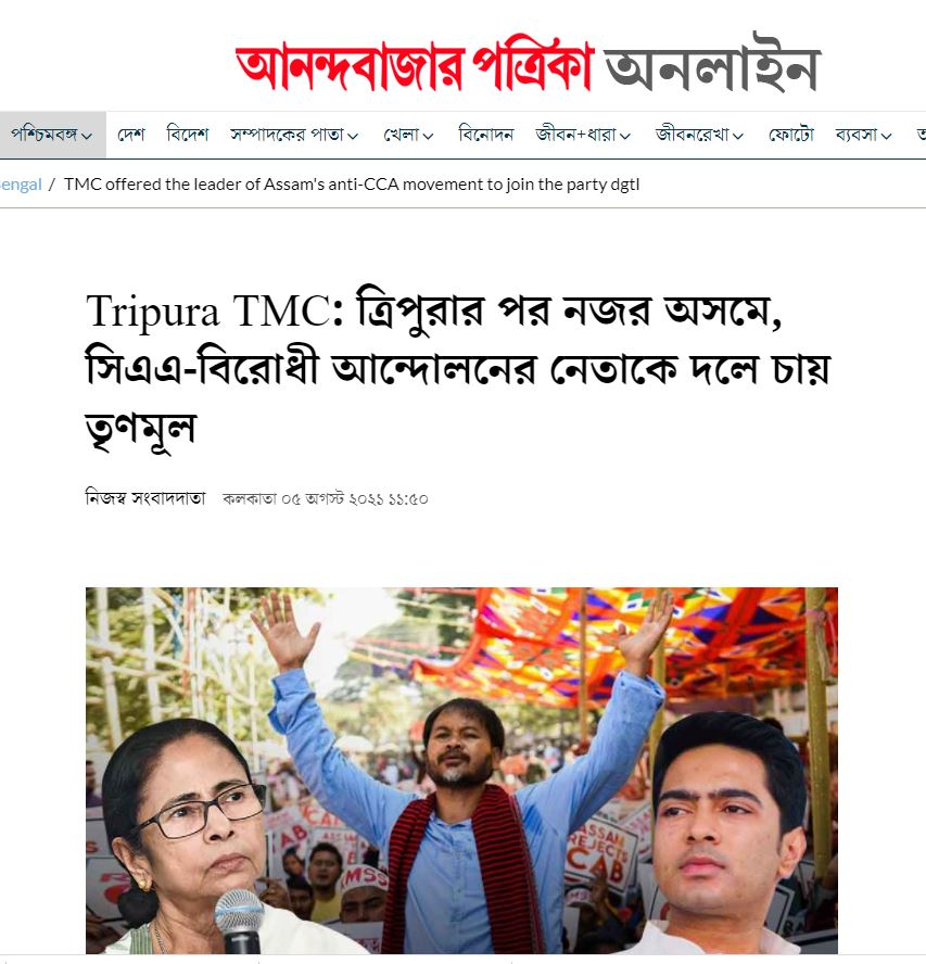 ‘আনন্দ বজাৰ পত্ৰিকা’ৰ বাতৰিটোত এইদৰেও উল্লেখ কৰা হৈছে যে নাগৰিকত্ব সংশোধনী বিধেয়ক সংসদত উত্থাপন হোৱাৰ আগৰে পৰা তৃণমূল কংগ্ৰেছে এই বিধেয়কৰ বিৰোধিতা কৰি আহিছে ৷ তৃণমূলৰ শীৰ্ষ নেতৃত্বই আশা কৰে যে তেওলোকৰ এই ‘কা’ বিৰোধী অৱস্থান অসমৰ ৰাজনীতিত সহায়ক হ’ব ৷ তদুপৰি অখিল গগৈৰ দৰে সংগঠক পালে তৃণমূল কংগ্ৰেছৰ সংগঠন বিস্তাৰতো অধিক সুবিধা হ’ব ৷